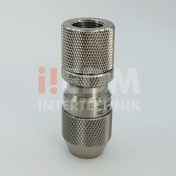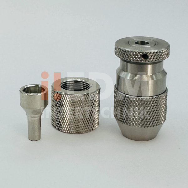 Mandril de precisão completo, em inox, para máquinas de furo rápido para microtubos de Ø0.10 a Ø3.00 mm com pino centralizador, rosca para montagem e alojamento para vedação.